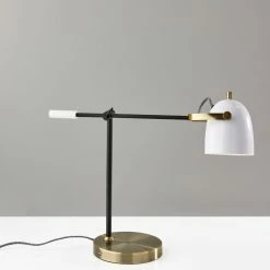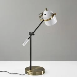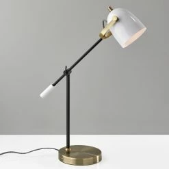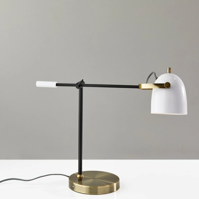 With a built in USB port, the Casey Desk Lamp is practical choice to stay connected in any room. A mix of black, white and antique brass metals creates a unique, color blocked style that adds a modern touch to your space. An adjustable shade and arm allows for maximum efficiency and convenience. The power cord is wrapped with black and white fabric turning a technical detail into a design enhancement.