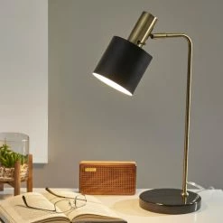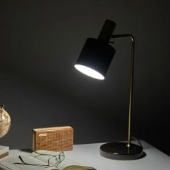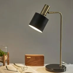 An essential addition to mid-century modern decor, the Emmett Desk Lamp is both functional and stylish. A small footprint allows this piece to fit neatly on the night stand or desk without taking up too much space. An adjustable shade allows for light to be directed where it is needed. A painted black metal and antique brass finish is accented by an elegant black marble base.