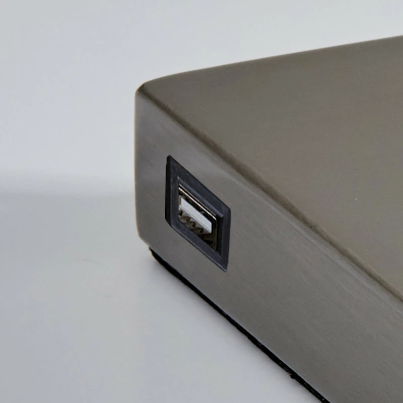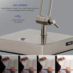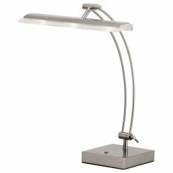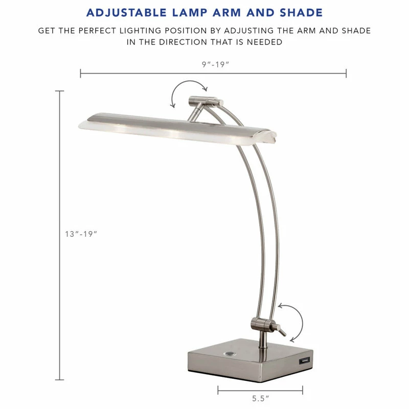 The Esquire LED desk light is modernized with a brushed steel finish and equipped with a 9 Watt full-spectrum LED light source. The LEDs simulate natural daylight for a brighter, glare-free light resulting in less eye strain. The lamp adjusts with locking keys at the shade and base. The long shallow metal shade has an acrylic shield that protects the three LED modules. A full range rotary dimmer switch is located on the base.