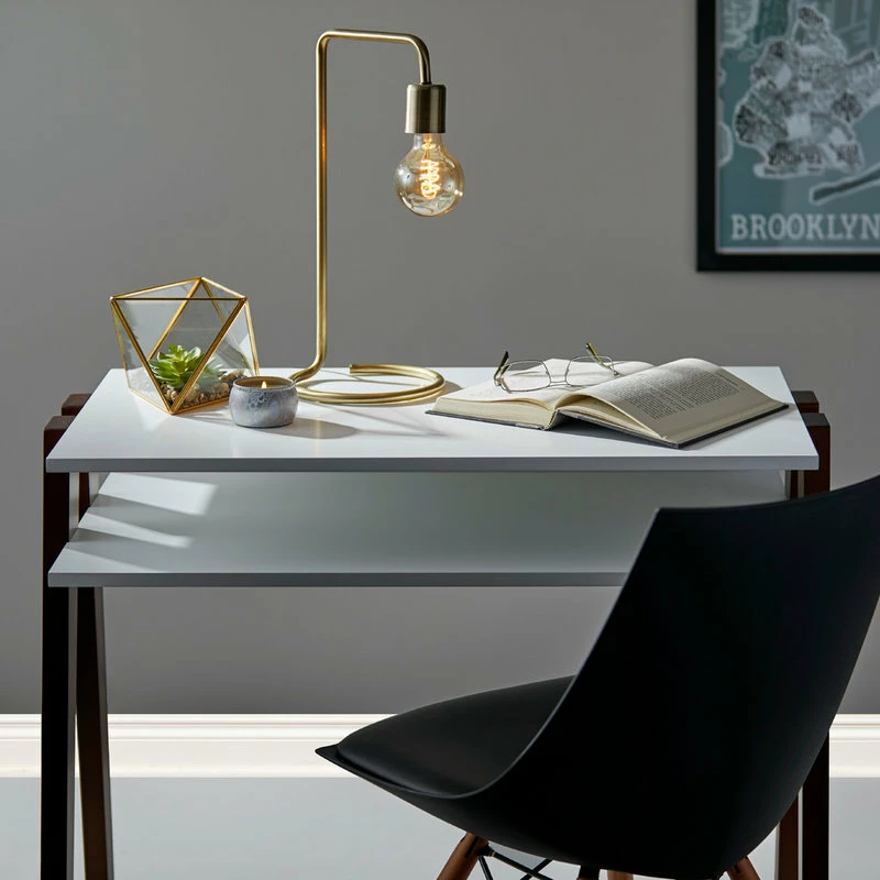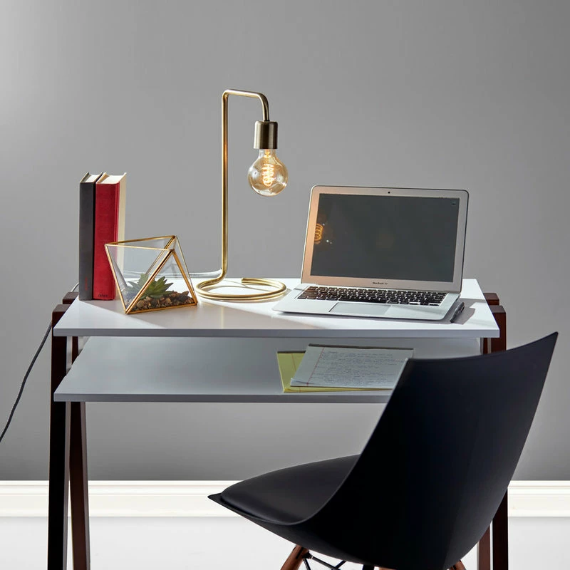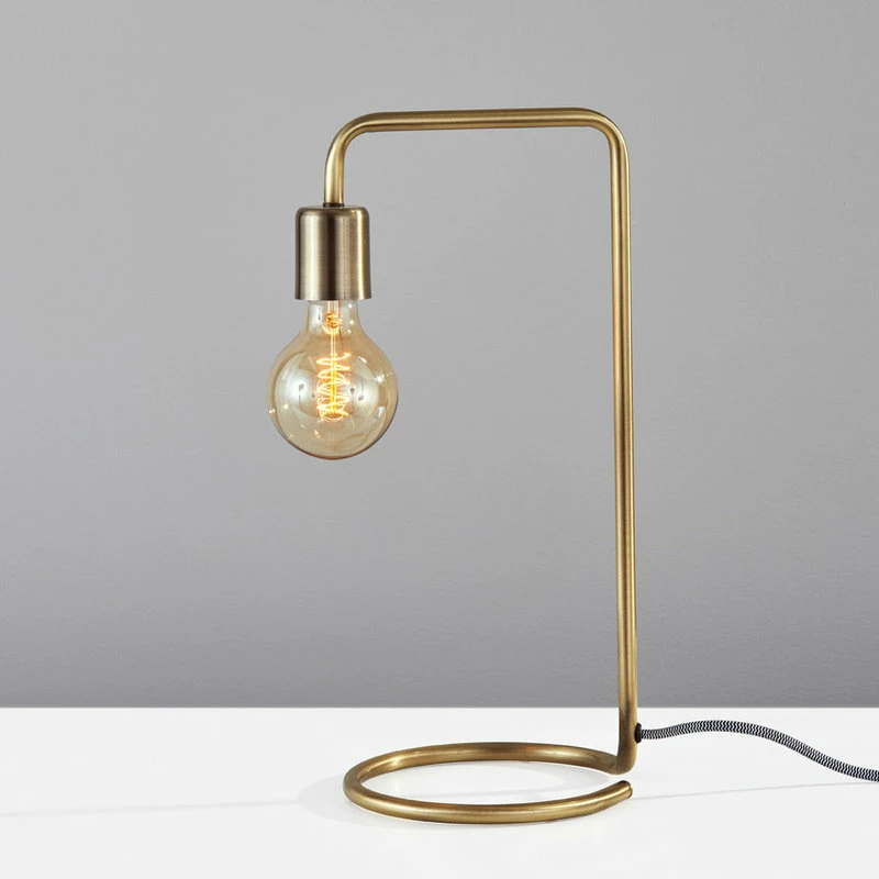 A mix of vintage and industrial styling, the Morgan Desk Lamp makes a statement wherever you place it. A thin metal tube creates the entire body of the lamp and flows continuously into a green fabric covered cord that pops perfectly against the matte black finish . An amber tinted vintage edison bulb, which is included with the item, provides warm, decorative light. A simple on/off switch is located conveniently on the cord.