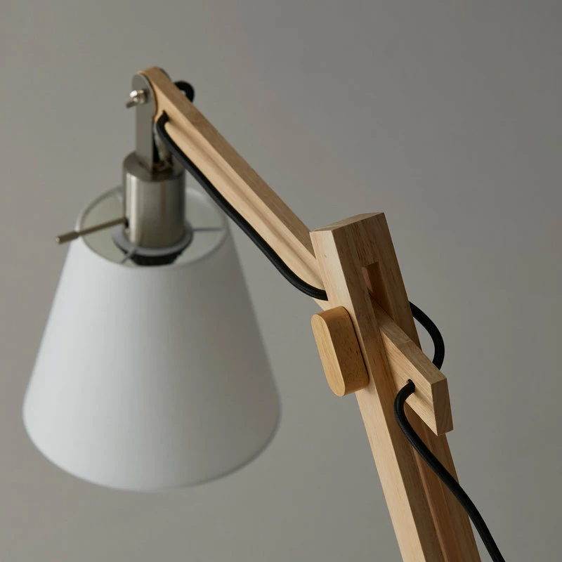 The Walden is an adjustable, rustic wood lamp with a slim profile (ideal for a compact desk or workspace) and wood pegs for adjusting shade height and angle. The square post has an open channel through which the black fabric power cord is threaded.