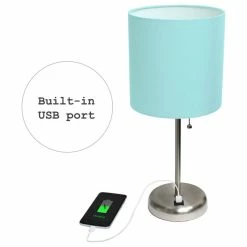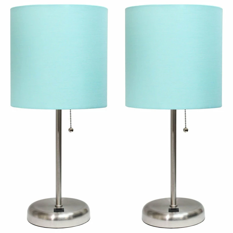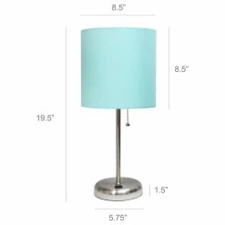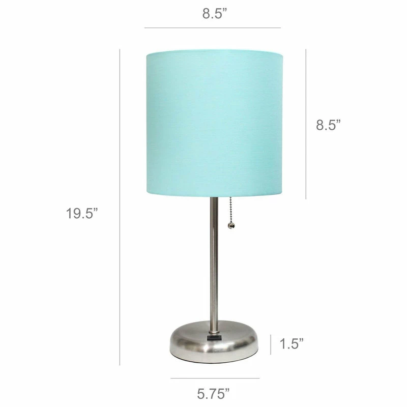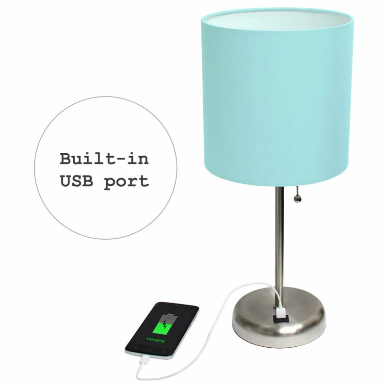 This fun and fashionable lamp features a brushed steel base and a fabric shade. It comes equipped with a USB seated in the base for use to charge mobile phones, handheld games, tablets, and other small electronics. This lamp will add a fabulous flair to any room. Perfect for bedrooms, kids and teens, college dorms, nurseries, or fun offices!