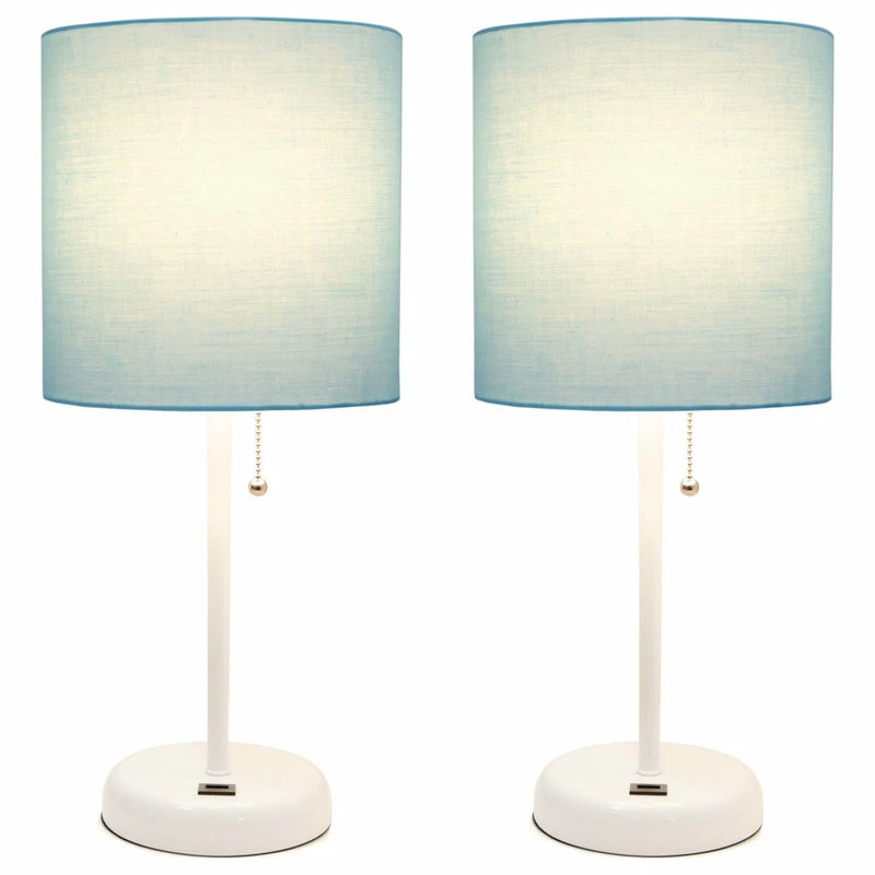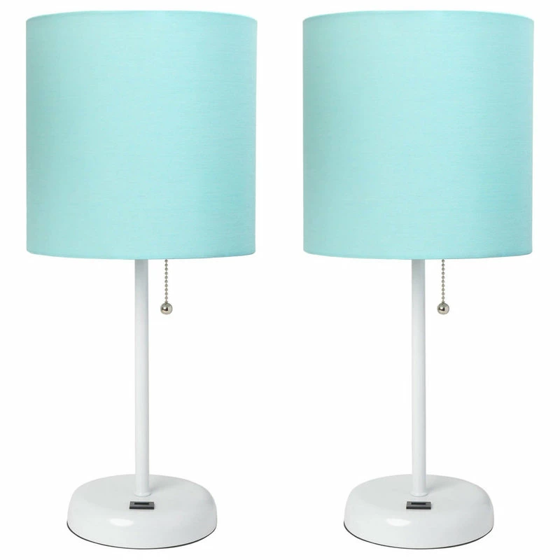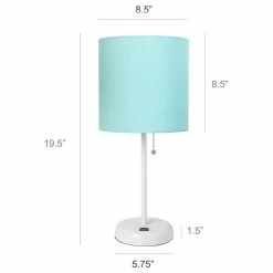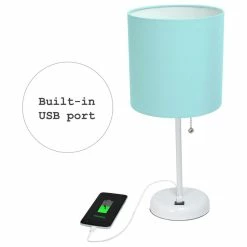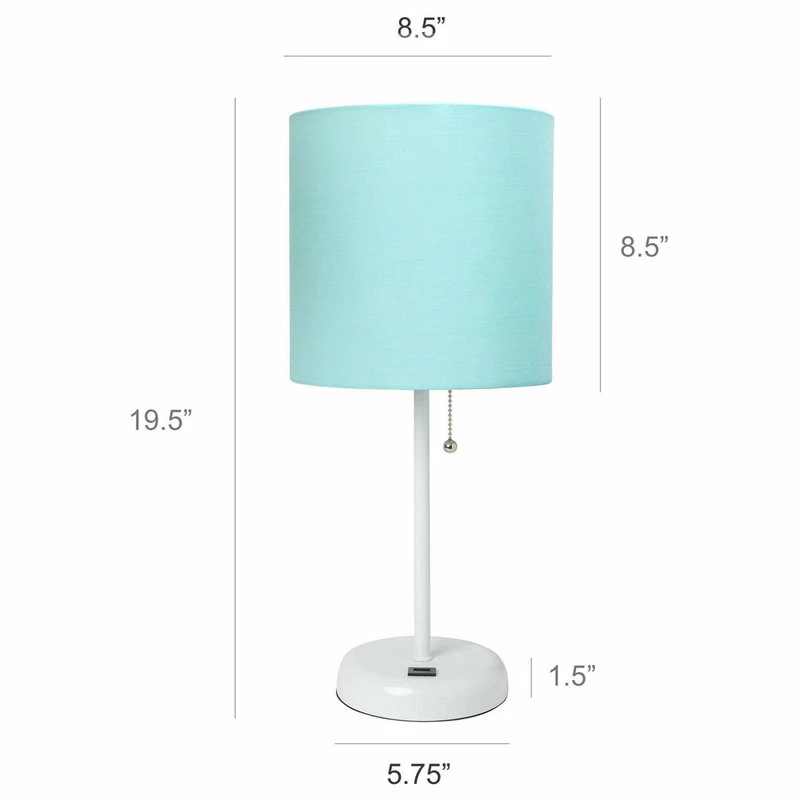 - White base with USB charging port on base. WHITE BASE/AQUA SHADE, Fabric Shade.