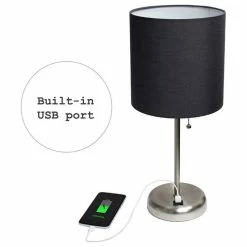 - Brushed Steel base with USB charging port on base. Fabric Shade