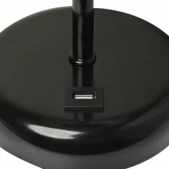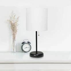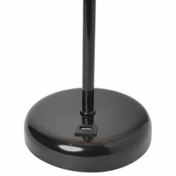 - Black base with USB charging port on base. Fabric Shade.