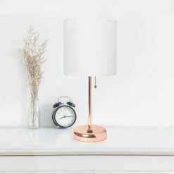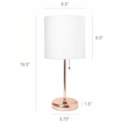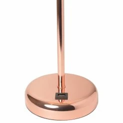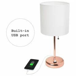 This fun and fashionable lamp features a rose gold base and a fabric shade. It comes equipped with a USB seated in the base for use to charge mobile phones, handheld games, tablets, and other small electronics. This lamp will add a fabulous flair to any room. Perfect for bedrooms, kids and teens, college dorms, nurseries, or fun offices!