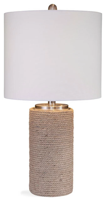 - The Lakeland Table lamp features a column design accented with jute rope. It is paired with a tan linen drum shade.