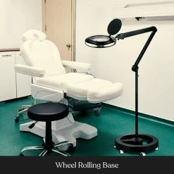 COMFORT & EASE OF USE FOR PROFESSIONALS: HANDSFREE USE & SMOOTH ROLL EVEN ON BAD SURFACES: Free both hands to work thanks to the flexible arms and pivoting head get the light and lens right where you want it; the powerful springs then keep it in place. The 6 wheels roll easily, making it perfect for spas and salons, estheticians, dermatologists, beauticians, jewelers, tattoo artists, dentists etc. Facials lash extensions and other treatments are a cinch.