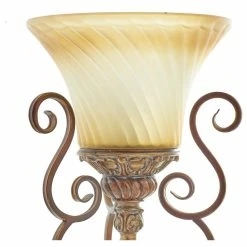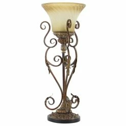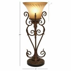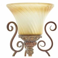 This mystical uplight is ideal for dim and orange-lit spaces with brown-hued interior/furniture. Designed with black rubber stoppers at the base that prevent scratching furniture and table tops, as well as sliding around. Requires 1 Standard Type E26 A incandescent bulb. Bulb not included. This item ships in 1 carton. Uplight comes with a 61.5 in. cord length. Suitable for indoor use only. Cream bell shaped glass lamp shade is 11″ x 11″ x 8″. Comes with a On/Off Switch. This items comes as a set of 2. Mediterranean style.