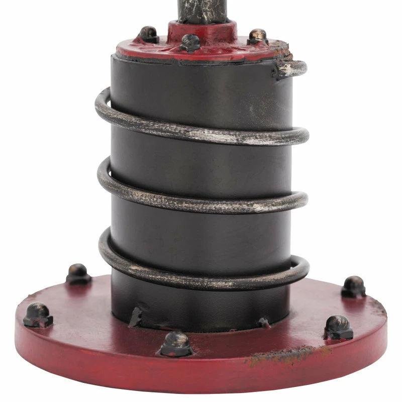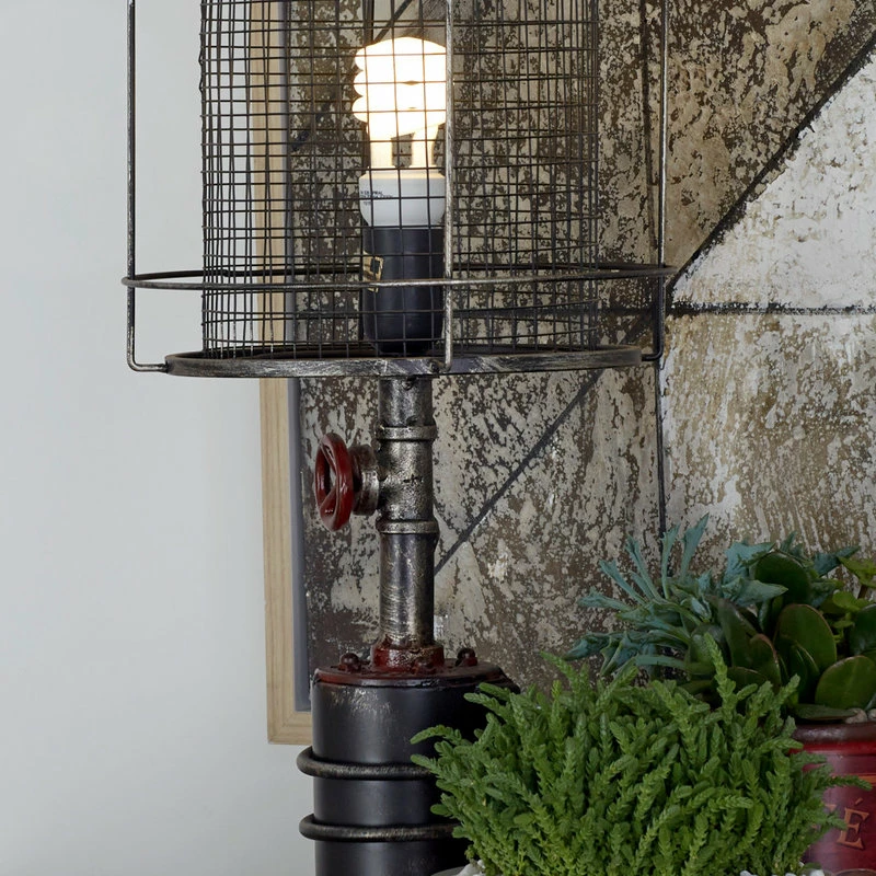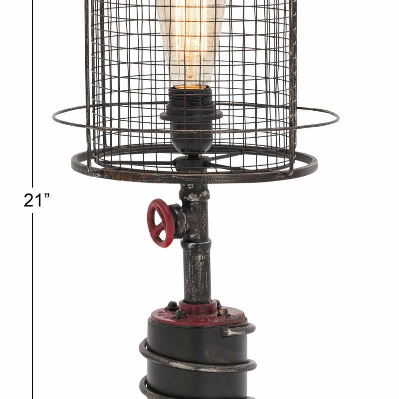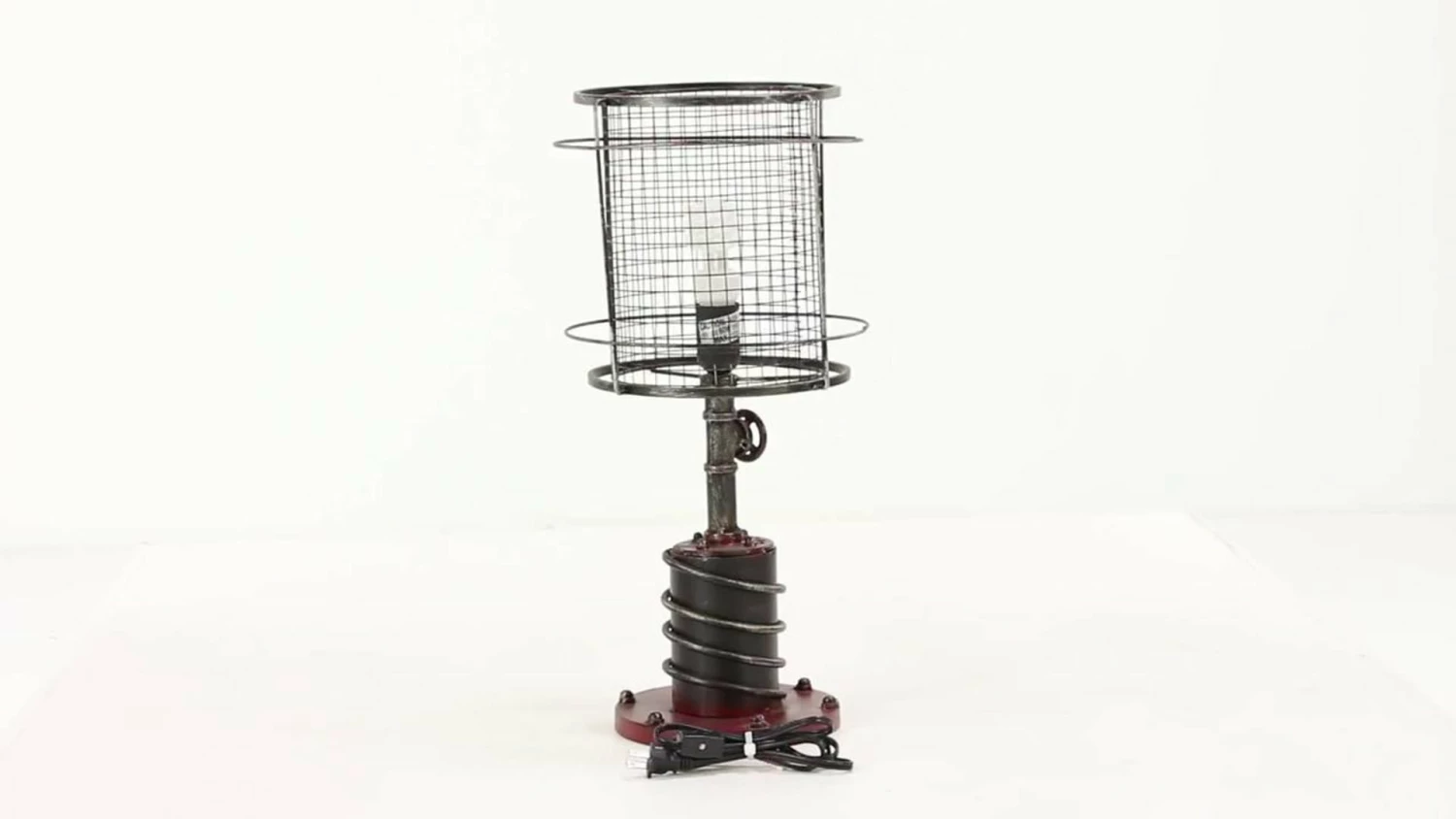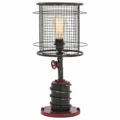 Brighten up any room to create a warming atmosphere for you and your guests with this chic table lamp. Perfect size as a table lamp or desk lamp, this accent decor brings warm, ambient lighting to any space needing some stylish edge. Bold accent decor for Industrial and eclectic-styled spaces, providing warm, ambient lighting. Designed with black rubber stoppers at the base that prevent scratching furniture and table tops, as well as sliding around. Uses one standard or Edison 60-watt bulb. Bulb not included. This item ships in 1 carton. Accent lamp comes with a 65 in. cord length. Features an accent lamp with open mesh metal shade and Edison bulb, black metal center column with a distressed red valve handle, and industrial red and black metal base with exposed hardware. Suitable for indoor use only. Metal novelty cage shade measures 11″L x 11″W x with a Slip UNO fitter. Black cord with on/off flip switch. This items comes as a set of 2. Industrial style.