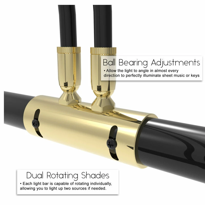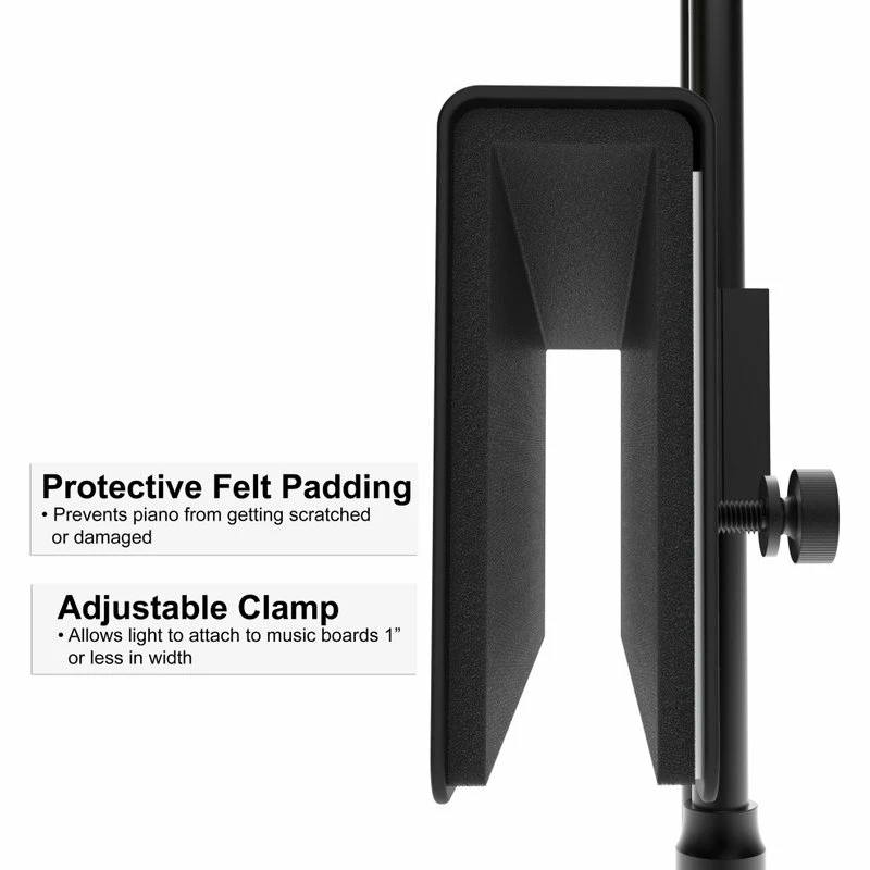 Don’t be fooled by this lamp’s simple design: not only is the felt-lined clamp able to be fitted to most music stands without any damage, but the shade is separated into two bi-rotational portions that can bend inward, outward, and side-to-side. The height of the lamp is also easily adjusted, suitable for sheet music and music stands of any size. No matter your set-up, the Cocoweb 22″ Grand Piano Lamp is able to rotate and adjust for the perfect angle to your playing!