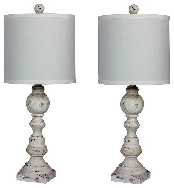 Two luxury lamps without the luxury price! Fangio Lighting’s #6241CAW-2PK Pair of 26 in. Resin Table Lamps in a Cottage Antique White finish will instantly add a charming vintage feel to any room. Attention to detail can be found in the intriguing, Distressed Balustrade design that will add a subtle rustic flare to your favorite space. The Cottage Antique White finish is fresh and new, made specifically to wonderfully compliment the trending color pallets found in homes today! Lamps includes designer shades made in a dοΏ½cor friendly hue of White. Each light comes complete with an easy to use On/Off switch and takes 1 bulb with a maximum wattage of 100 (Not Included.) Lamp set is UL and CSA Listed. Showcase your brilliant tastes by adding a warm cottage flare to your space! If you enjoy the welcoming lines of classic designs updated with a striking finish, this is the lamp collection for you! Bring this set home! You will be glad you did!