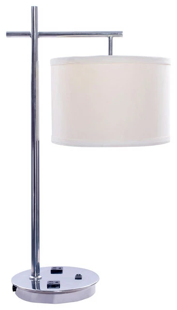 Fangio Lighting’s #1750XX 26 inch Tech-Friendly Metal Table Lamp is sure to become an instant favorite. The sleek, clean lines of this silver Chrome lamp will add a touch of sophistication to any room. Chrome is one of today’s most desired finishes in modern day homes due to its easy ability to compliment most decorating genres. Show off your pristine sense of style and taste without sacrificing function., for this light comes complete with two convience outlets in its base. Keep all your elextronic gadgets within reach while they charge! No more hunting for outlets behind furniture or bending and stretching to reach a port. This lamp allows all your technology to charrge while you use them with ease. The On/Off rocker base switch is super easy to use and the designer energy shade allows you to have more clean light shine through! Illuminate your decorating possibilites! Bring this lamp home! You will be glad you did! Item is both UL and CSA approved and will fit beuatifully in any traditional, modern or contemporary home. Lamp is also perfect for any college student looking to save space while showing off their impressive style!.