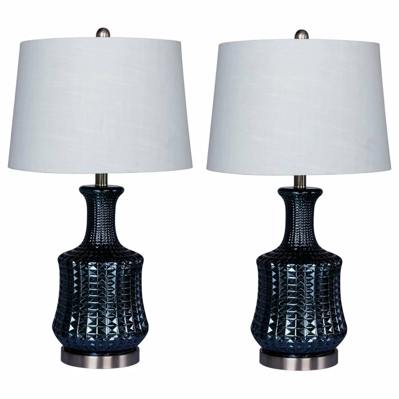Two luxury lamps without paying a luxury price! Fangio Lighting’s #5156DB-2PK 27.5 in. Modern Riveted Dark Blue Glass & Brushed Steel Metal Genie Bottle Table lamps is sure to instantly charm. Attention to detail can be found in the striking look and stunning design that will add a subtle whimsical flare to your favorite space. The Brushed Steel finish is among the most desired in homes today while Blue is frequently used for the touch of warmth it infuses into a room! Each lamp includes a designer shade made in a decor friendly hue of White. Each light comes complete with an easy to use 3-Way switch. This collection takes 2 bulbs, each with a maximum wattage of 100 (Not Included.) Each lamp is UL and CSA Listed. Showcase your discerning tastes brilliantly with this pairing. The stylized, Modern Riveted Genie Bottle look possesses its own presence while illuminating your exquisite decorating tastes. If you enjoy the graceful lines of Transitional designs or inspiring looks of modern forms, this is the set for you! Bring these items home! You will be glad you did!