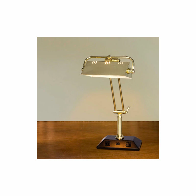 Fangio Lighting’s #1122 SB 24″ Metal Lamp is sure to become an instant favorite. Don’t sacrifice style for function! Illuminate your desired location while brilliantly showcasing your sense of style at the same time. The classic banker lamp design, has been brought into the present with the addition of two, tech friendly, convenience base outlets! Now you can continue working with all your handheld devices charging within reach. The Satin Brass finish wonderfully compliments any decor, while the open metal arm form aids in creating a sense of space. The lamp comes complete with an easy to use on/off rocker base switch and a matching metal shade. The light uses a 40 max-watt bulb (not included.) Bring this item home and you’ll infuse a refined touch of elegance immediately into any room! Whether you love Traditional charm or enjoy making a sleek, Modern statement this is the lamp for you! Item is both UL and CSA listed.