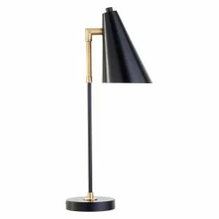 Upgrade the lighting of your desk, craft table, or bedside with this modern update of a classic task lamp. The low-profile design features a squared neck and asymmetrical cone-shaped shade, calling to mind mid-century modern design. Finished in complementary black and brass tones, this fixture will add subtle retro styling in your reading nook, home office, or bedroom.