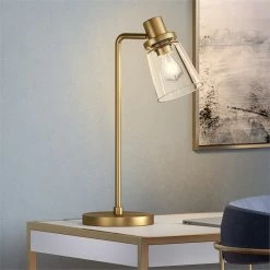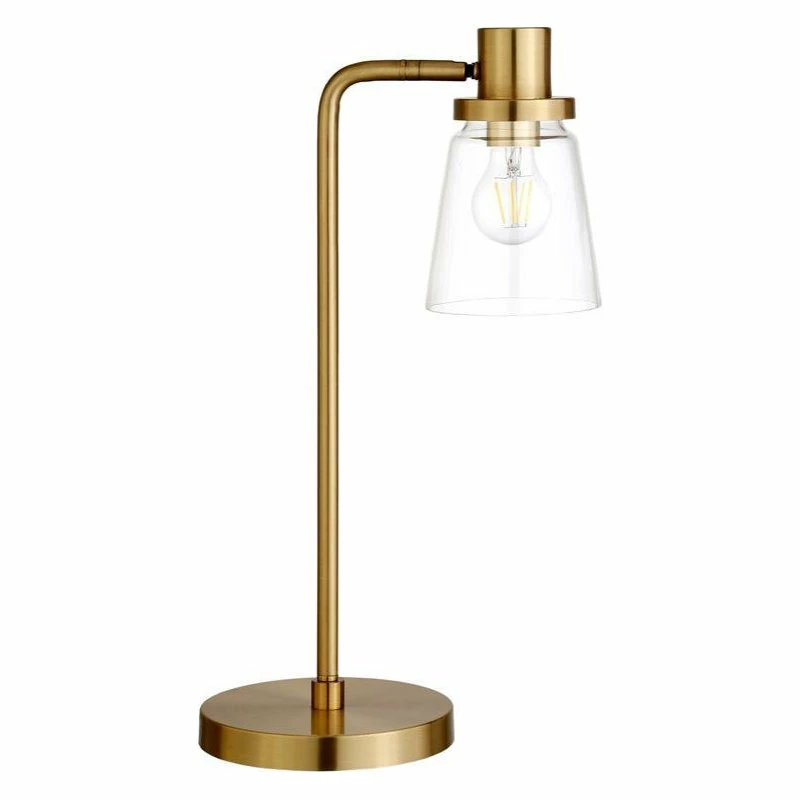 Elevate your reading nook or home office set-up with this sleek update on a traditional design. This task lampβs slender neck is gently arched and capped by an adjustable capped cone glass shade. Finished in a warm neutral metallic tone, this fixture will add polished contemporary style in any room of your home.