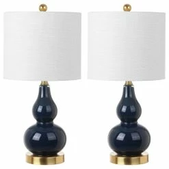 The smaller scale of this classic double-gourd table lamp makes it the perfect fashionable and functional accent for a console table or nightstand. The hand-blown glass body stuns in a gorgeous shade of navy, finished with a brass-plated base pedestal and matching accents. Up top is a white linen fabric shade and brass-colored sphere finial. A classic glass lamp with a modern shape, this piece will add both light and style to a variety of rooms. This item is sold as a set of two.