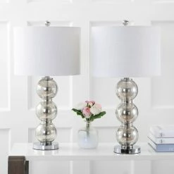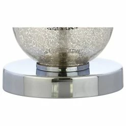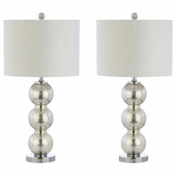 Glass blown into a trio of perfectly aligned orbs makes this shapely lamp base an eye-catching addition to any home d’cor. Colored in a versatile mercury glass with a chrome base and fittings, the look is completed with a matching finial and linen drum shade. Style extends all the way to the plug with a silk-wrapped cord reminiscent of classic antiques.