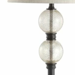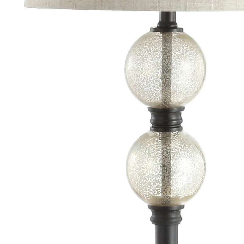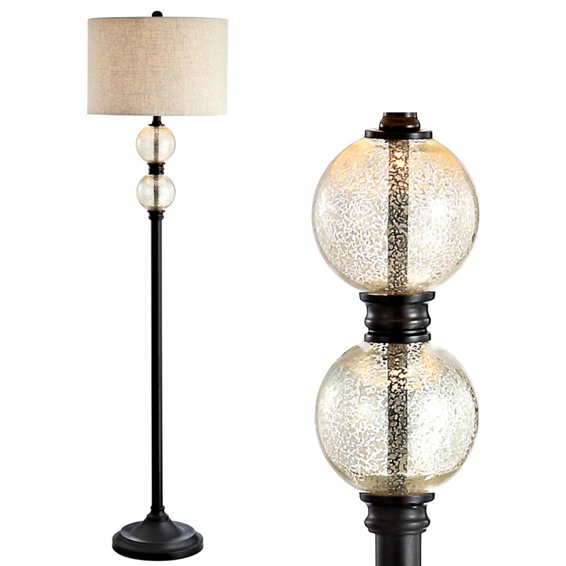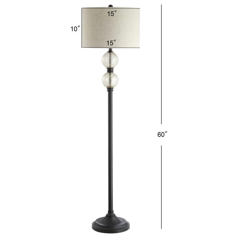 A classic 60″ tall floor lamp with a drum shade gets added interest with the addition of two glass orbs that seem to glow as light casts on them when illuminated. The perfect height for creating a reading nook beside a sofa or chair, the 15″ drum shade allows for ample light without being glaring. Finished in oil rubbed bonze and with a silk-wrap cord, you simply press the step-on on/off switch to illuminate the light.