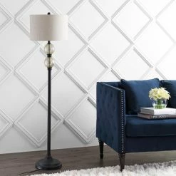 - Tall and elegant, this glass-accented floor lamp adds stature to any space