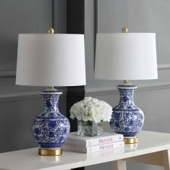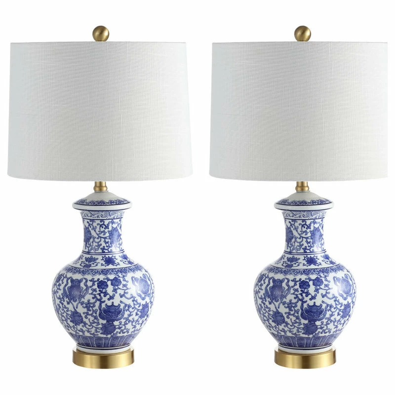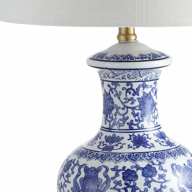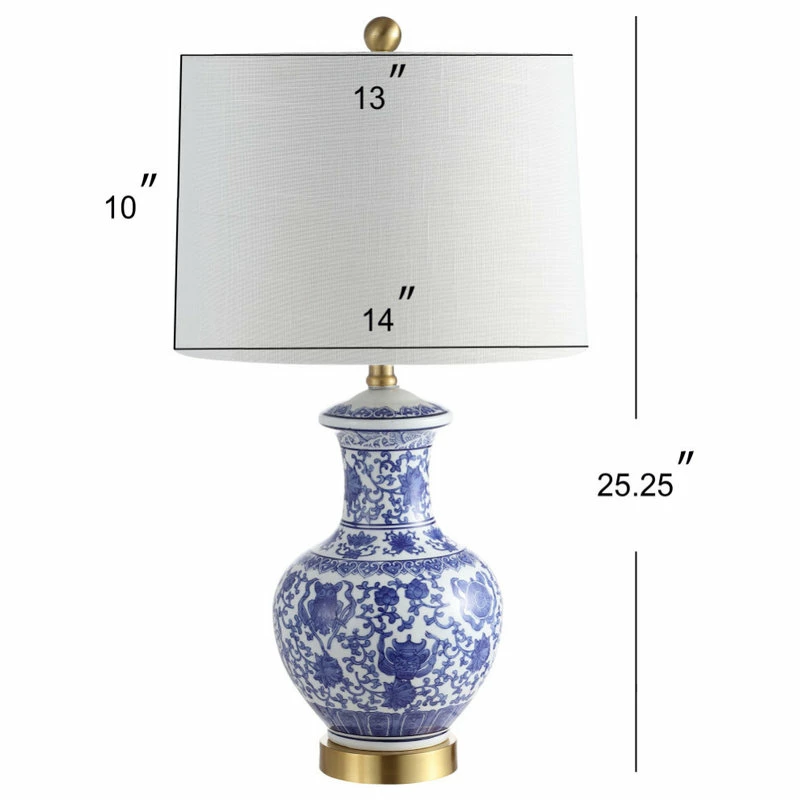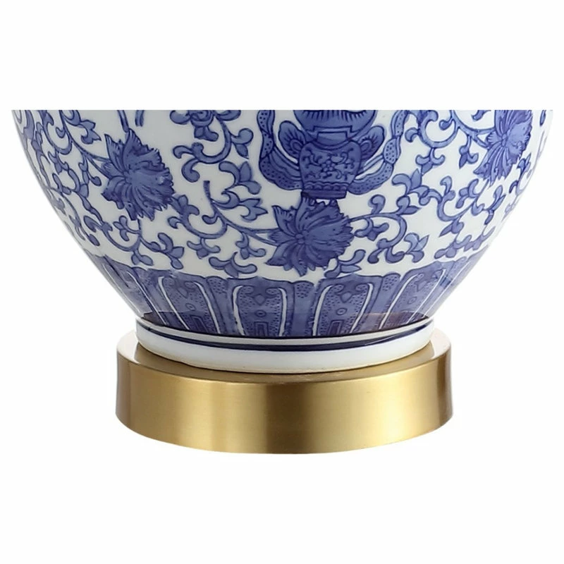 This ginger jar lamp mixes a classic blue and white design with beautiful brass finishes. Featuring a silk-wrapped cord, a linen drum shade, and a brass finial, this piece spares no details. Between the antique-like body and refreshing finishes, this piece strikes a perfect balance between traditional and contemporary.