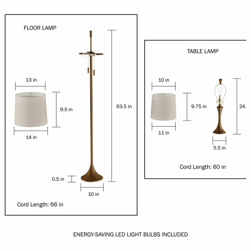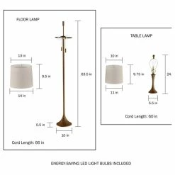 PRODUCT DETAILS- Materials: Steel and Linen. Table Lamp: 11L x 11W x 24.5H. Shade: 11 Bottom Diameter x 9.75H. Cord: 60L. Floor Lamp: 14L x 14W x 63.5H. Shade: 14 Bottom Diameter x 9.5H. Cord: 66L.