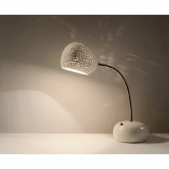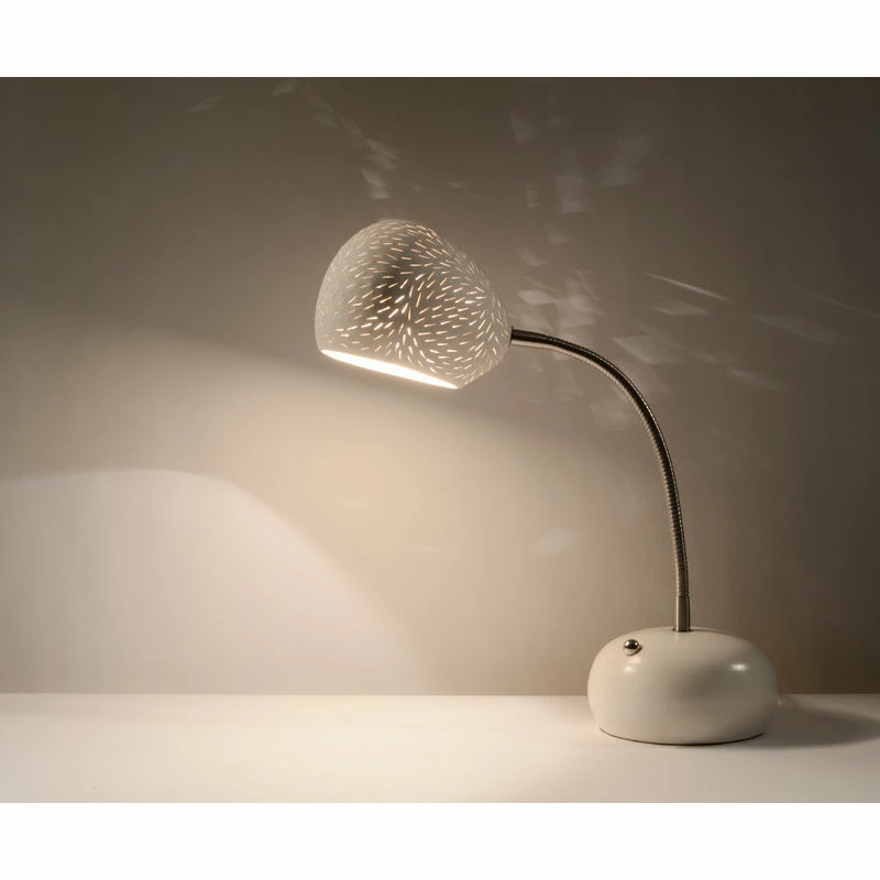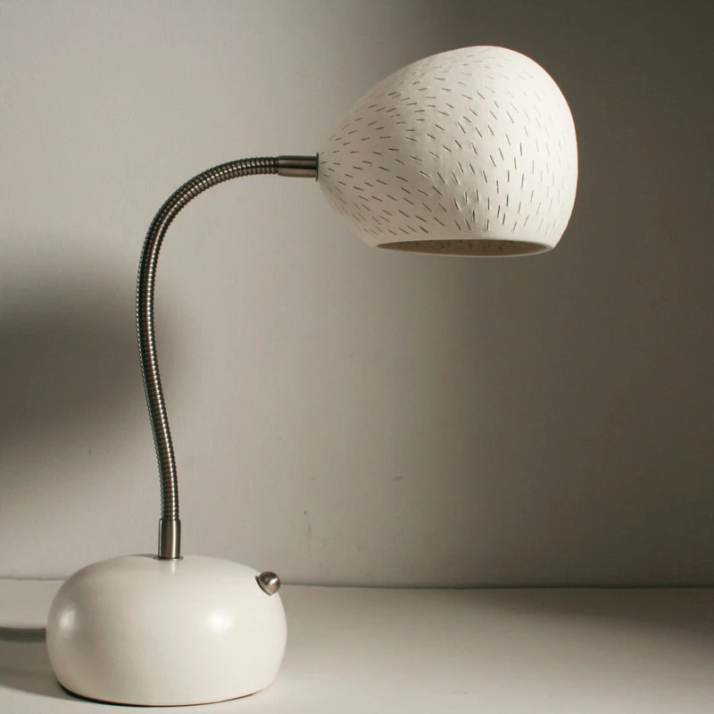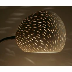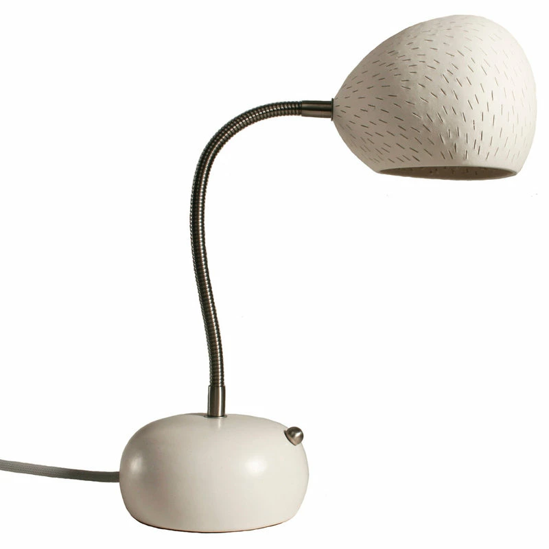 This porcupine shaped ceramic desk lamp emits a downwards task light and light textures around it. It has a touch dimmer knob on its base that activates with a short touch and dims it with a long touch.