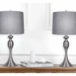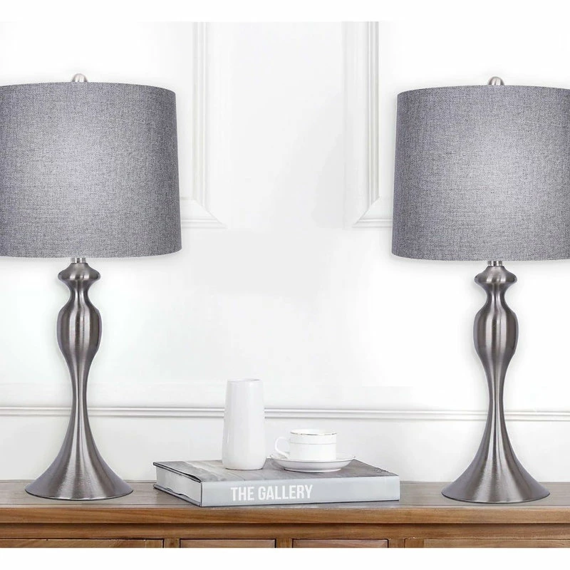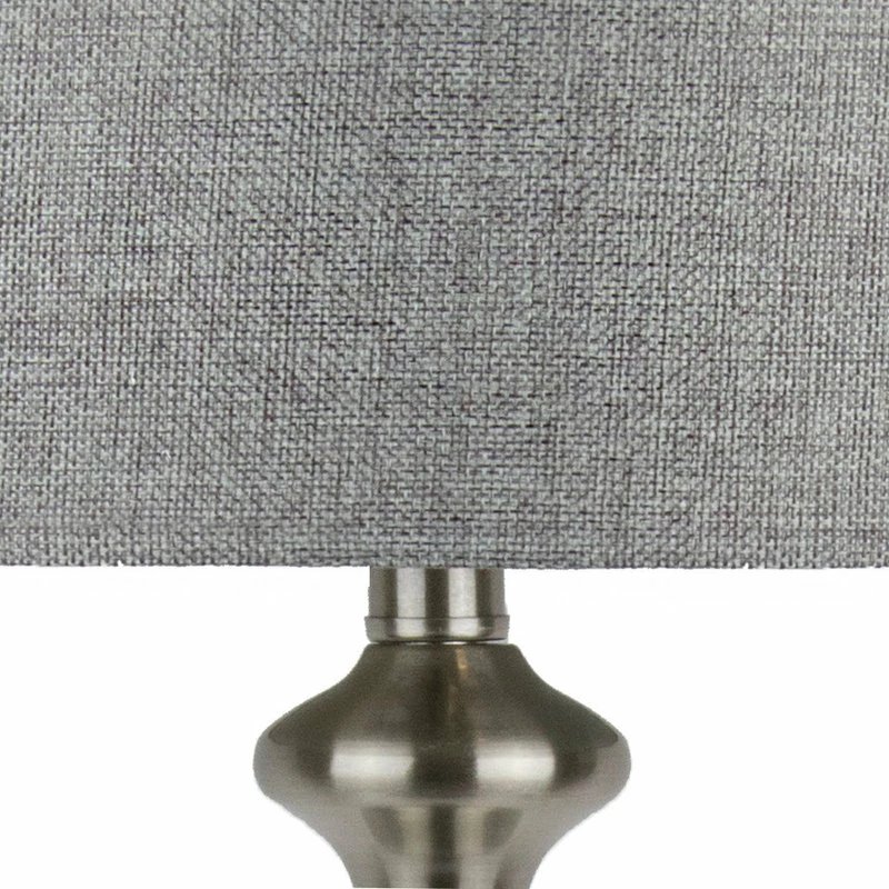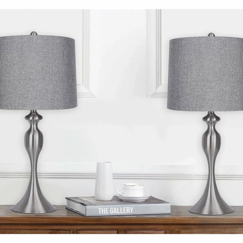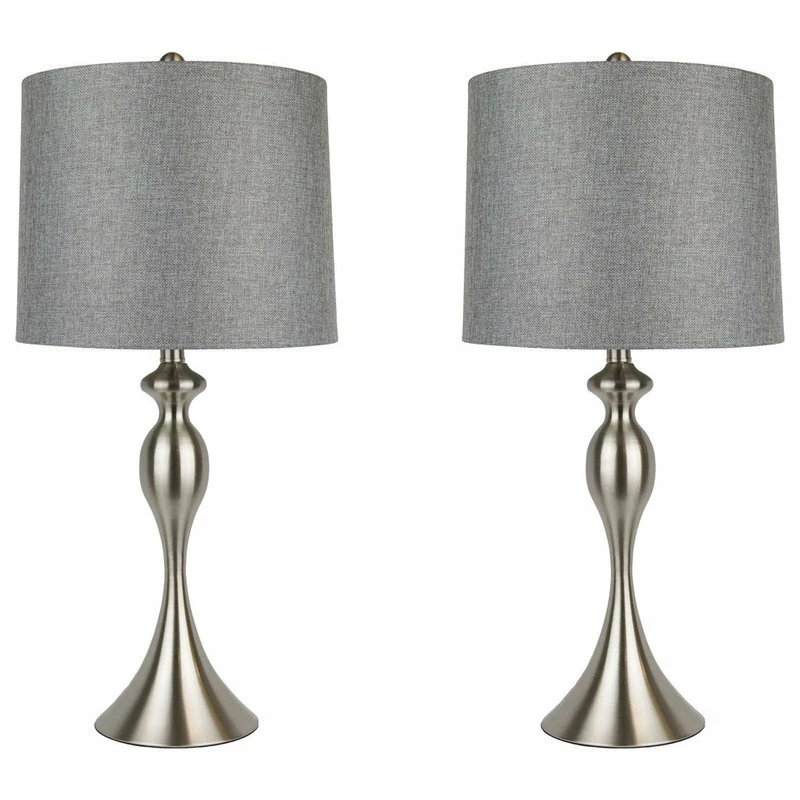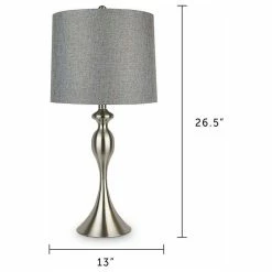 LINEN SHADE AND BRUSHED NICKEL These 26.5 total height table lamps feature a gray lampshade with a curvaceous lamp body, finished in brushed nickel. They add the perfect finishing touch to any space.