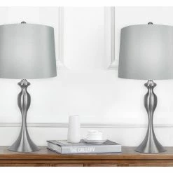 SET OF TWO This set of two table lamps with a light grey lamp shade is the perfect addition to any space to provide additional light or just as a beautiful dcor element! SILK AND BRUSHED NICKEL These 26.5 total height table lamps feature a versatile light grey silk-like lampshade with a curvaceous lamp body, finished in brushed nickel. They add the perfect finishing touch to any space! CLASSIC AND CONTEMPORARY The classic and contemporary design elements and grey lamp shade color ensure these lamps perfectly complement any style, type or color dcor. FOR BEDSIDE AND MORE This pair of grey lamps is perfect for setting on bedside tables, dressers, front entry tables, dining buffets, couch side tables or any space that youre looking to add some wow to! HIGH-QUALITY AND DURABLE These table lamps are the highest quality, durable and sure to last the test of time. Youll be enjoying additional light and a beautiful dcor touch for years to come!