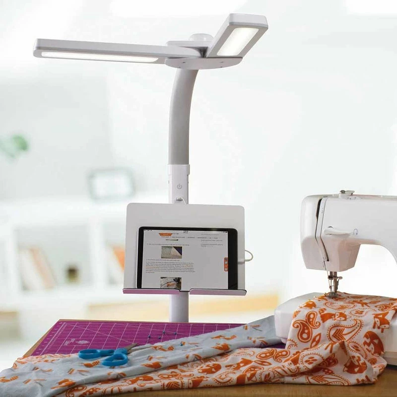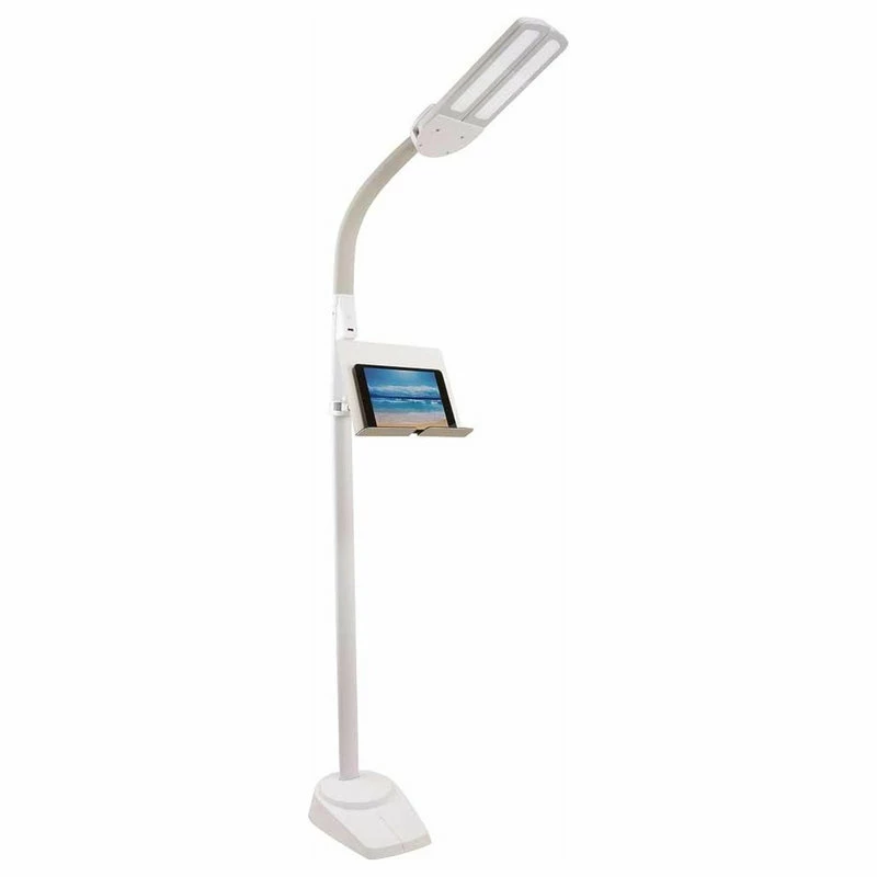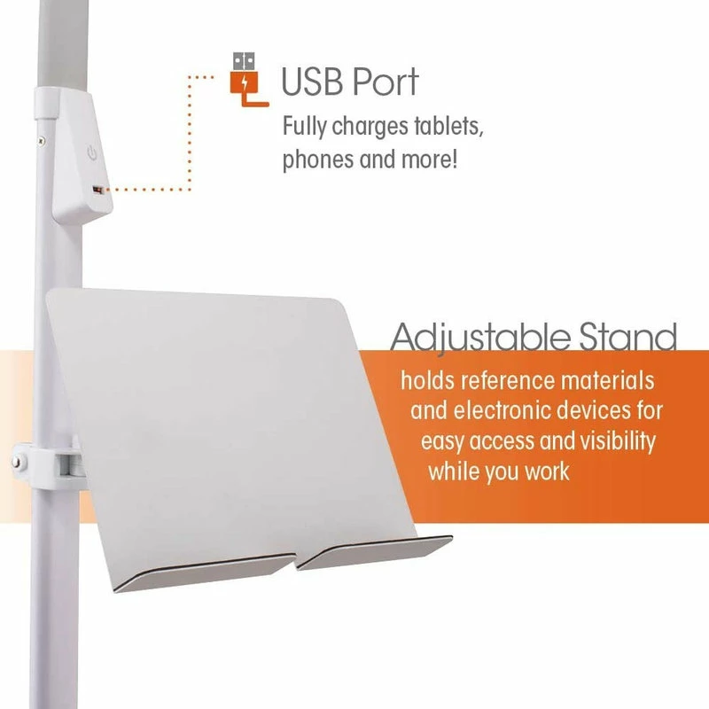 The OttLite Dual Shade LED Floor Lamp with USB Charging Station is the perfect reading and crafting lamp with a dual head design that pivots to 180 degrees (or anything in between). Easily change the three brightness levels to meet your workspace illumination needs. Adjustable and convenient, the stand helps securely holds your tablet or smartphone so you can have quick access to websites, social media, projects and instructions. Youโll also be sure to stay fully connected and charged with the convenient 5V, 2.1A USB port. With OttLite Natural Daylight LED Illumination, you can see details clearly and reduce glare and eyestrain so you can do what you love, longer.