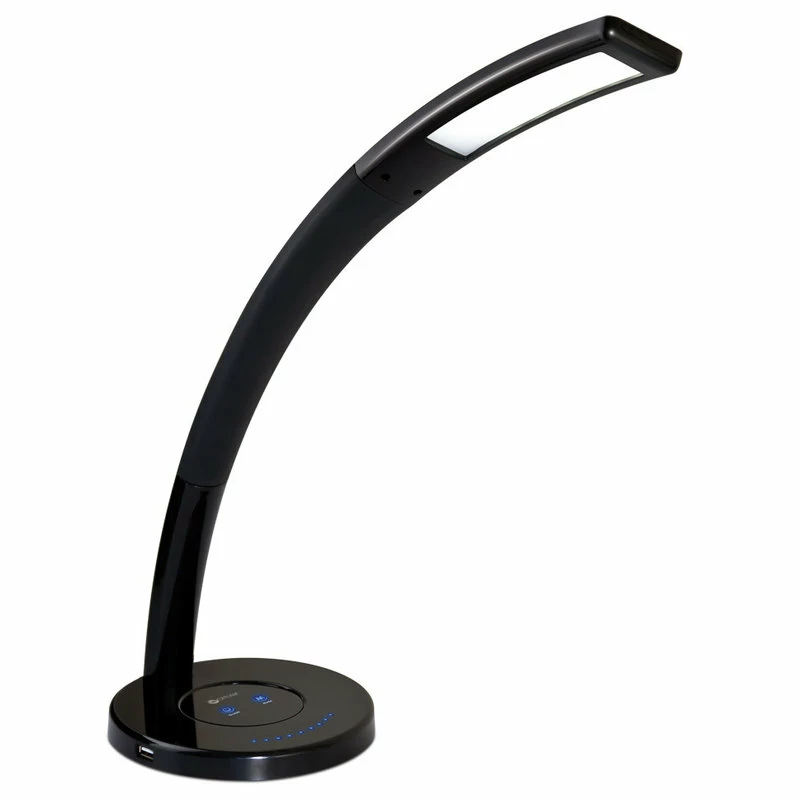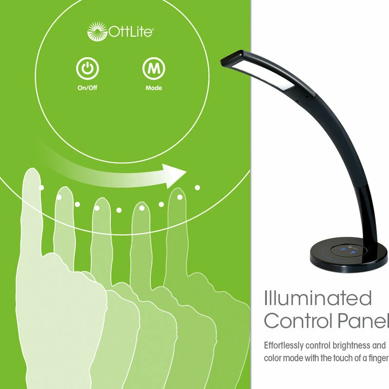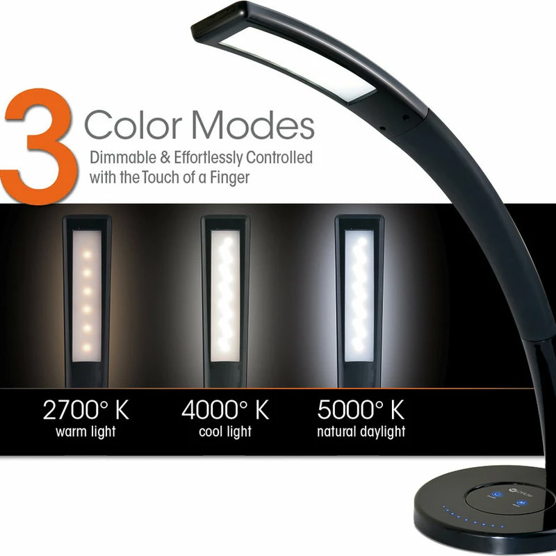 The OttLite LED Cobra Desk Lamp features 3 color modes (warm light, cool light and natural daylight) to brighten your work area. With a graceful arching design, the LED Cobra Desk Lamp twists and flexes to easily direct light over a wide area. An illuminated control panel lets you adjust brightness at the touch of a finger and a built-in USB fully charges your tablet and smartphone. With its sleek and innovative design, the LED Cobra Desk Lap is perfect for offices, dorm rooms, countertops, end tables and more. Built-in USB port fully charges tablets, smartphones and more (5V, 2.1A). Super bright natural daylight LEDs rated to last up 40,000 hours. With OttLite you can see details clearly and reduce glare & eyestrain so you can do what you love, longer.