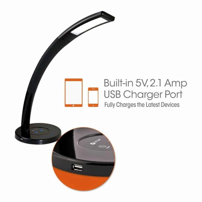 The OttLite LED Cobra Desk Lamp features 3 color modes (warm light, cool light and natural daylight) to brighten your work area. With a graceful arching design, the LED Cobra Desk Lamp twists and flexes to easily direct light over a wide area. Touch lamp features an illuminated control panel that lets you adjust brightness at the touch of a finger and a USB port that fully charges your tablet and smartphone. With its sleek and innovative design, the LED Cobra Desk Lamp is perfect for offices, dorm rooms, countertops, end tables and more. With OttLite you can see details clearly and reduce glare & eyestrain so you can do what you love, longer.