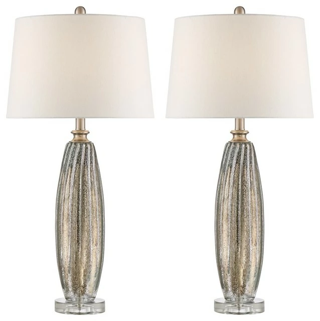 Tall, fluted bodies create a stunning look for this set of two glass table lamp, each with a wonderfully subtle champagne finish. The lamps rest of crystal disc bases and are topped with linen drum shades.