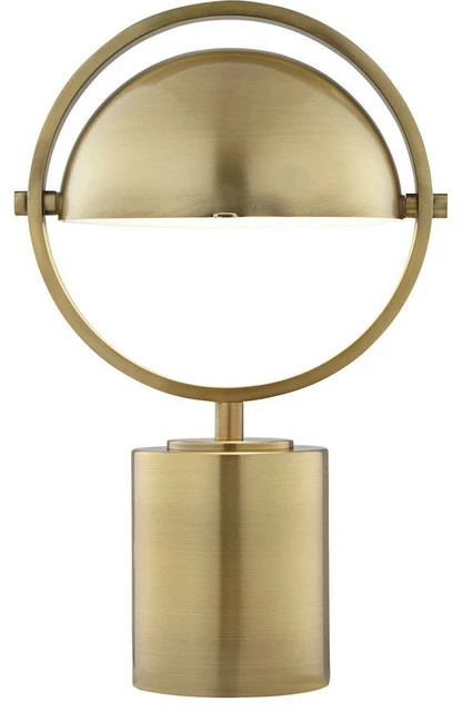A dome shade set with open rings brings exceptional style to this metal table lamp. In a beautiful brushed antique brass finish that glows warmly, this lamp evokes a retro sensibility mixed with contemporary elements to create an exquisite design.