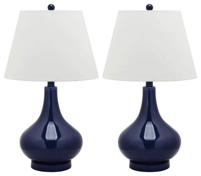 Reflect an aura of sophistication with the glimmering navy blue Amy Gourd Glass Lamp with matching finial, metal base and neck. Complemented with an elegantly tapered pure cotton shade that illuminates the room.
