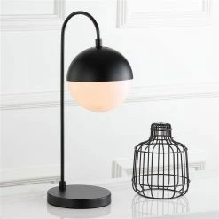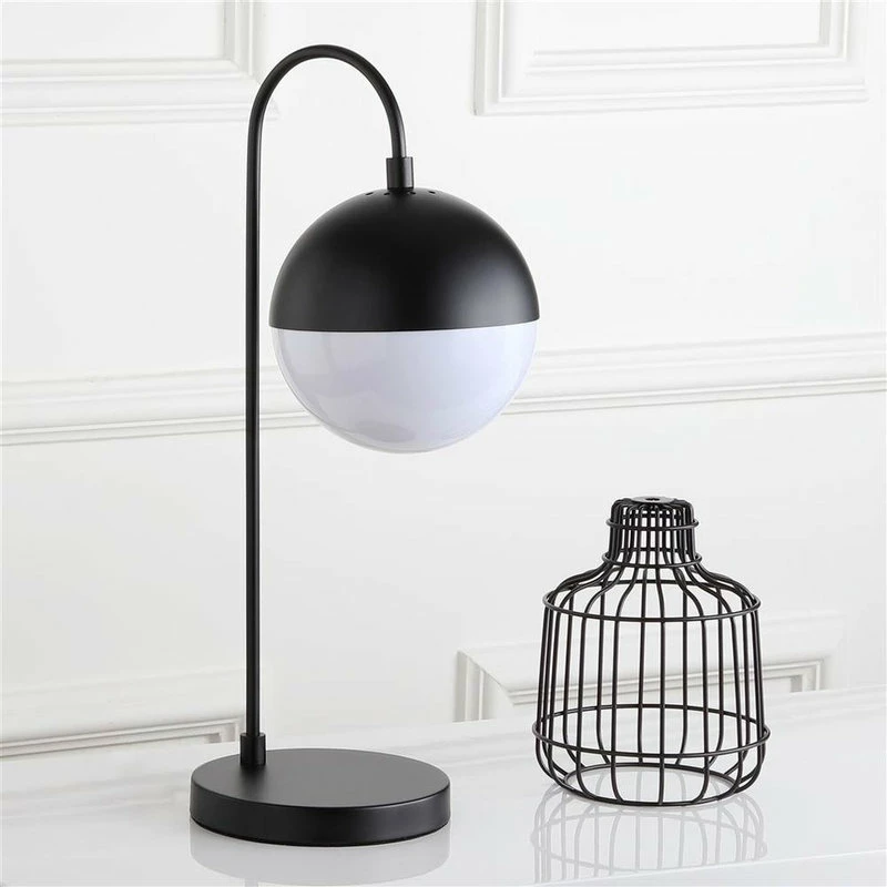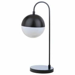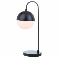 Inspired by edgy mid-century modern style, this contemporary table lamp steals the show in any living room. Designed with a luxurious modern black finish, it diffuses light from a partially white retro globe shade to create a warm glow.