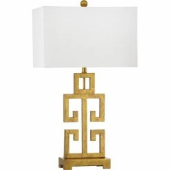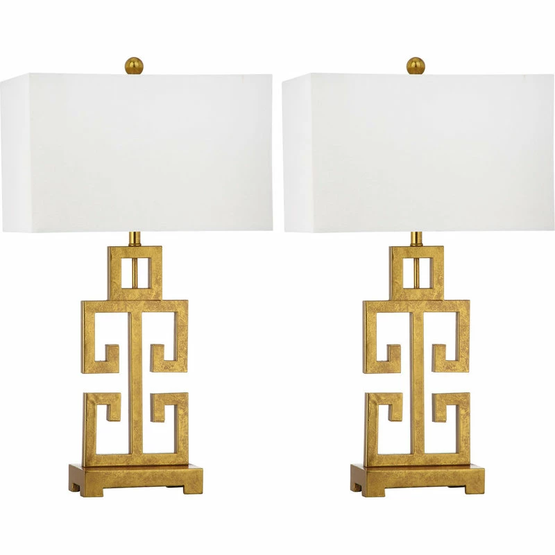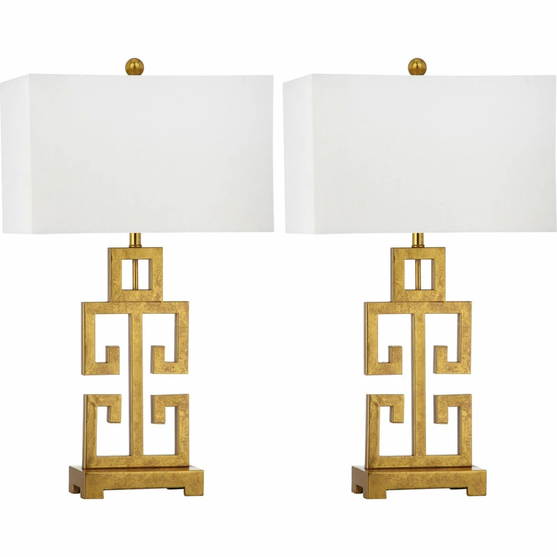 Infinitely versatile and adaptable to myriad decorating styles, the set of two Greek Key table lamps stars the iconic Greek symbol for infinity. This design is crafted of antique gold-finished metal with a rectangular box shade in white textured cotton.