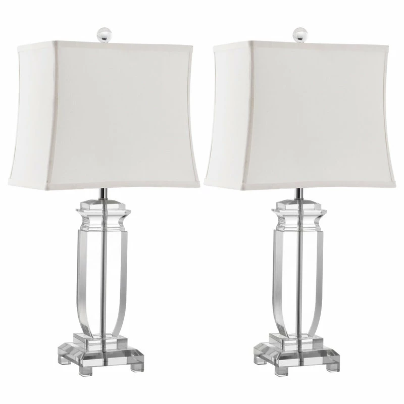 Romantic and feminine, the harp-shaped crystal base of the Olympia table lamp clearly adds sparkle to living room end tables and bedroom nightstands. With silver stand and fittings, and rectangular shade in linen-weave white cotton, this crystal lamp also boasts a 3-way switch lets you adjust from reading light to mood lighting.