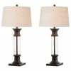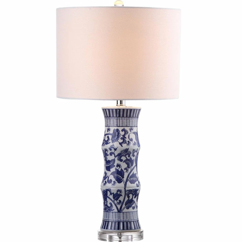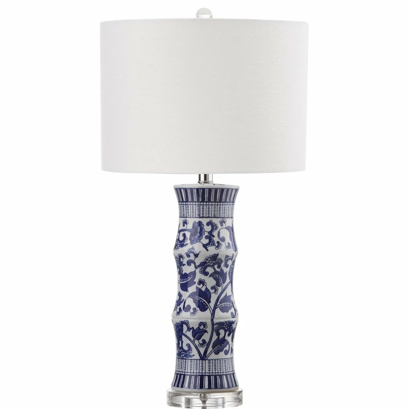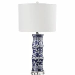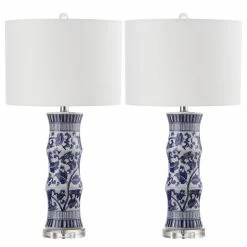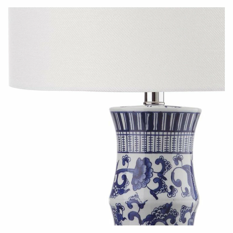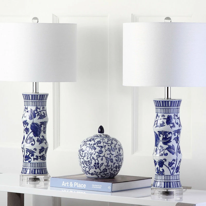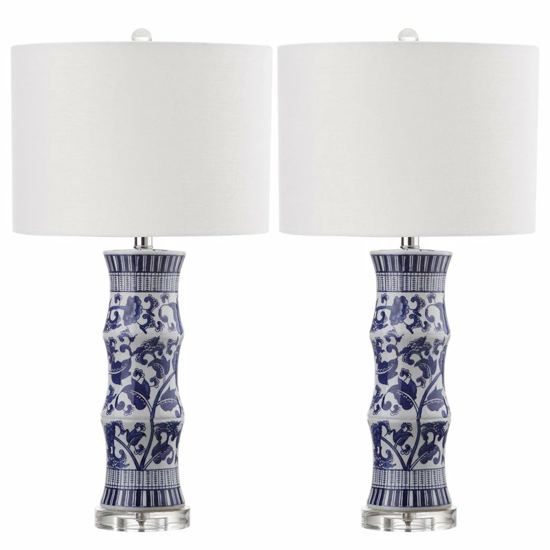 Inspired by an antique beaker vase, this set of 2 blue and white ceramic Sandy table lamps is banded with an intricate stripe motif for striking contrast. A textured white cotton drum shade and acrylic pedestal and finial update a timeless classic look.
