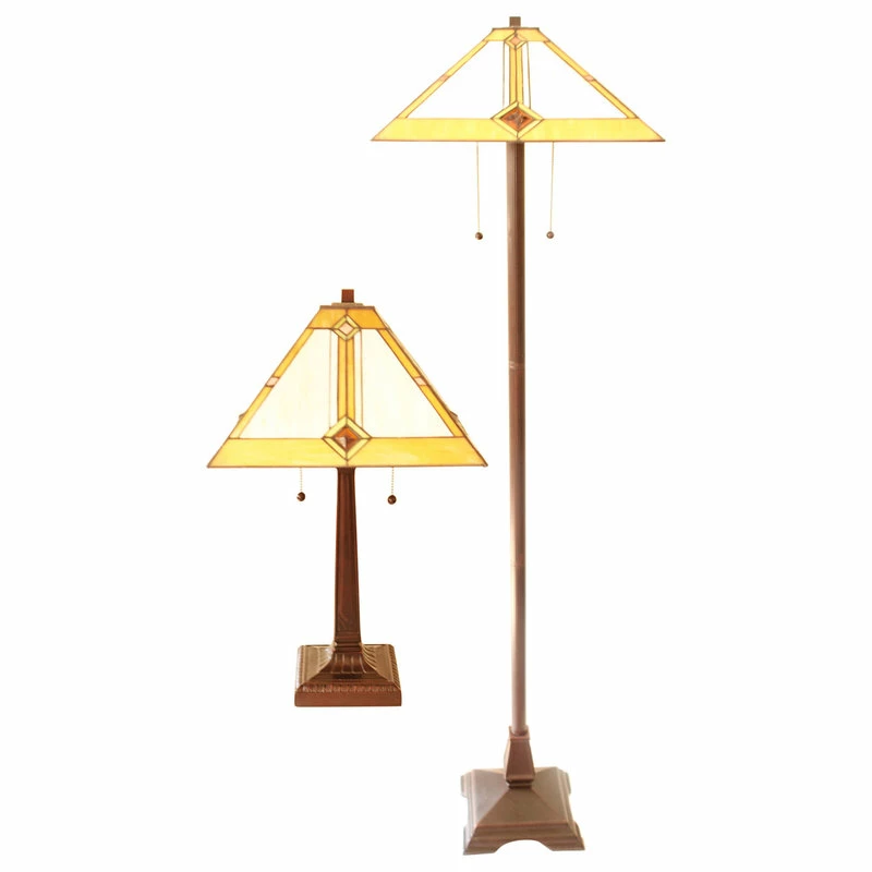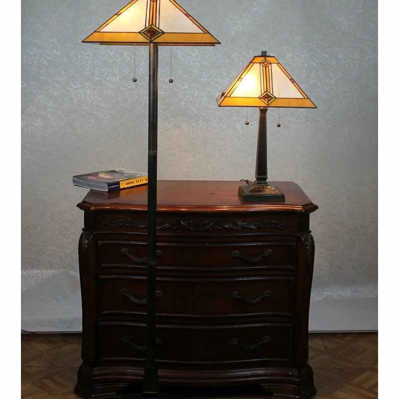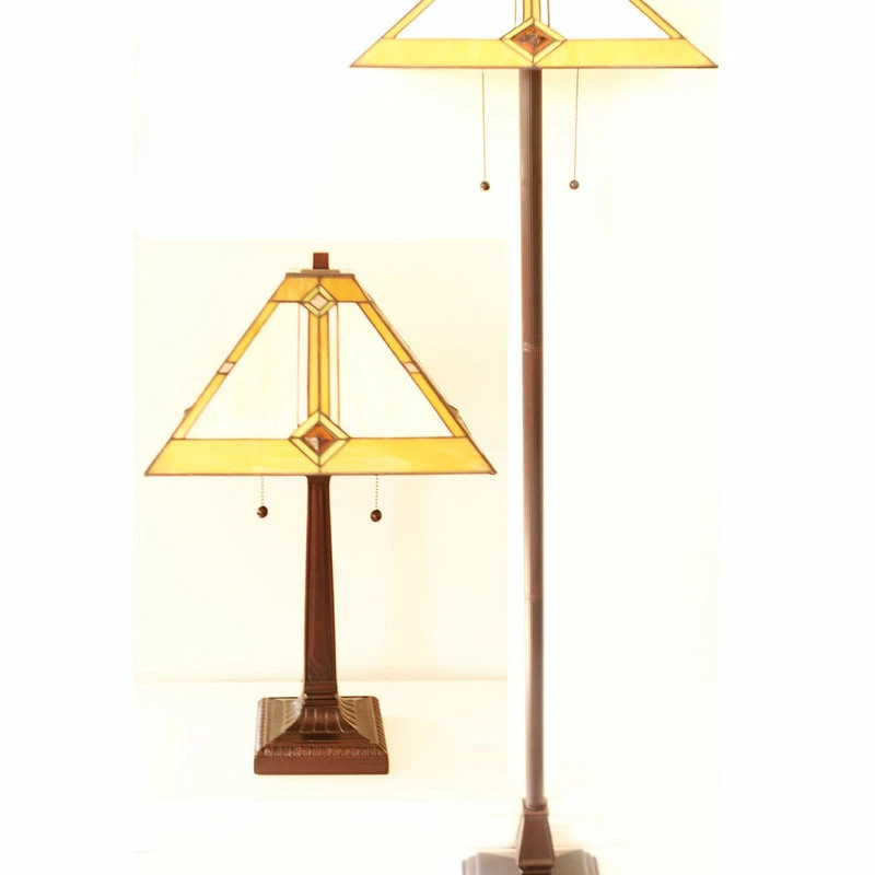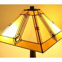 - Mission style stained glass shades in cream and beige with amber cabochons