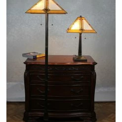 Add new style to your home decor with this table and floor lamp set. The design has simplicity and elegance. The color tones of beige and amber make it versatile for any room.