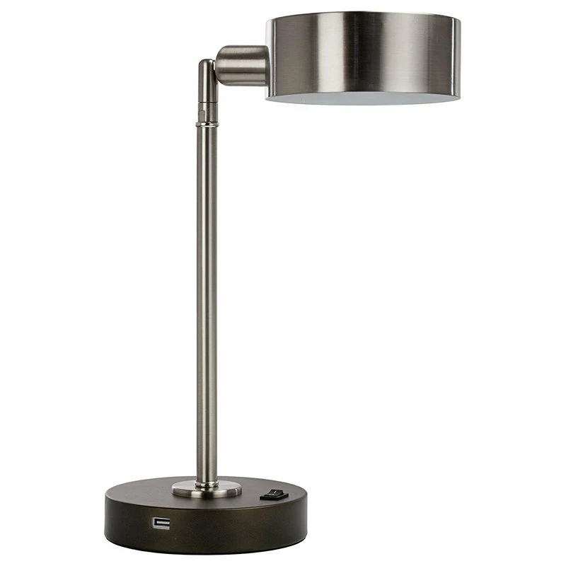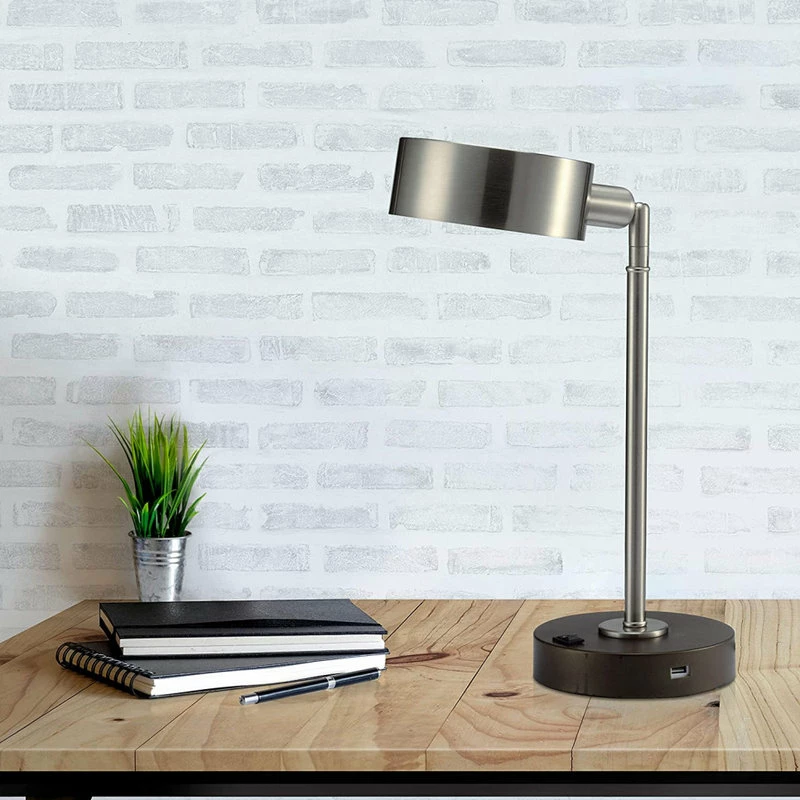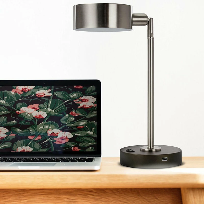 Adjust the shade vertically or horizontally to direct your task lighting wherever you need it. Base features a USB charging port for smartphones or small electronics. Silver brushed steel body with dark matte finished metal base. Overall: 15″ height. Metal adjustable circular cap down light shade. Shade measures: 5 X 5 X 2.3″. UL Listed.