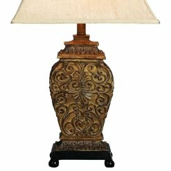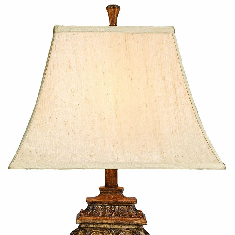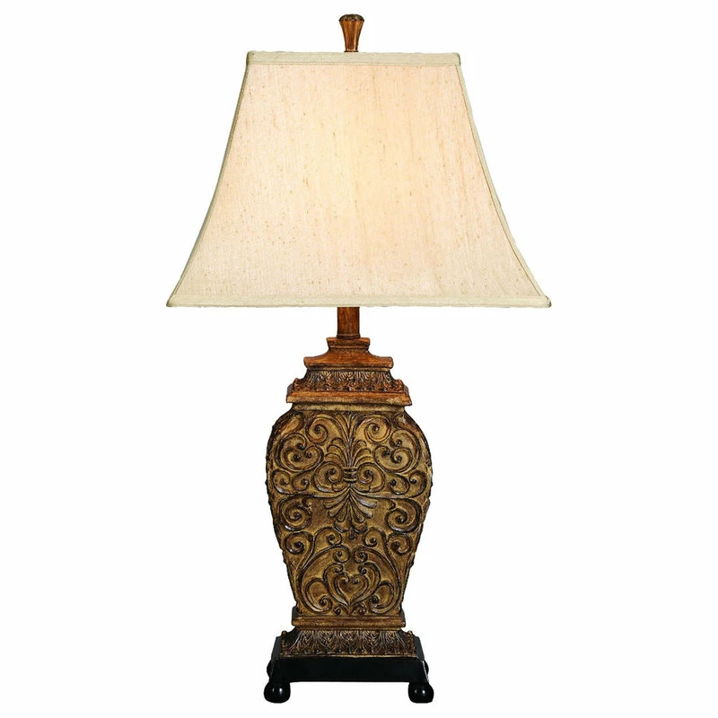 The beauty of Versailles is now yours to own. This polystone table lamp will be an exquisite addition to a refined bedroom or a sumptuous living room. The base is adorned with floral and scroll designs and lavished in a soft beige and brown leaf finish. A rectangular fabric shade in beige tops off this design. Set includes 2 lamps.